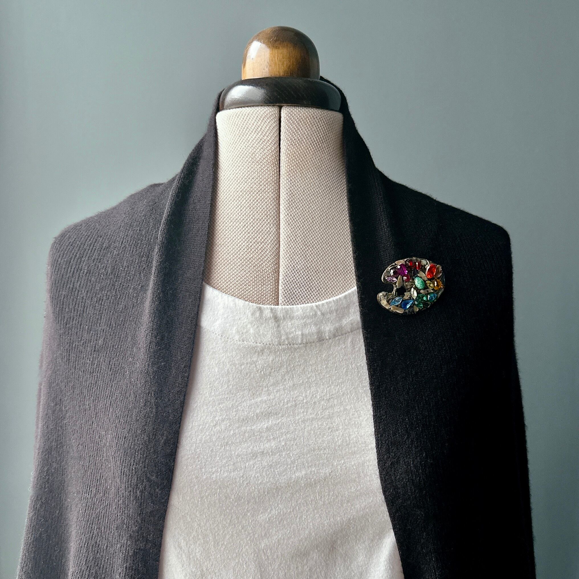 数々の受賞歴のある英国出身のジュエリーデザイナー、アニー・シャーバーンによって制作されたこの鮮やかなブローチは、まさに存在感あふれるステートメントピースです。色とりどりのガラスストーンや虹色に輝くアワビ貝のかけらを使用し、絵の具パレットを模した形に手作りされています。色彩と創造性への賛美が込められたインパクトあるジュエリーです。