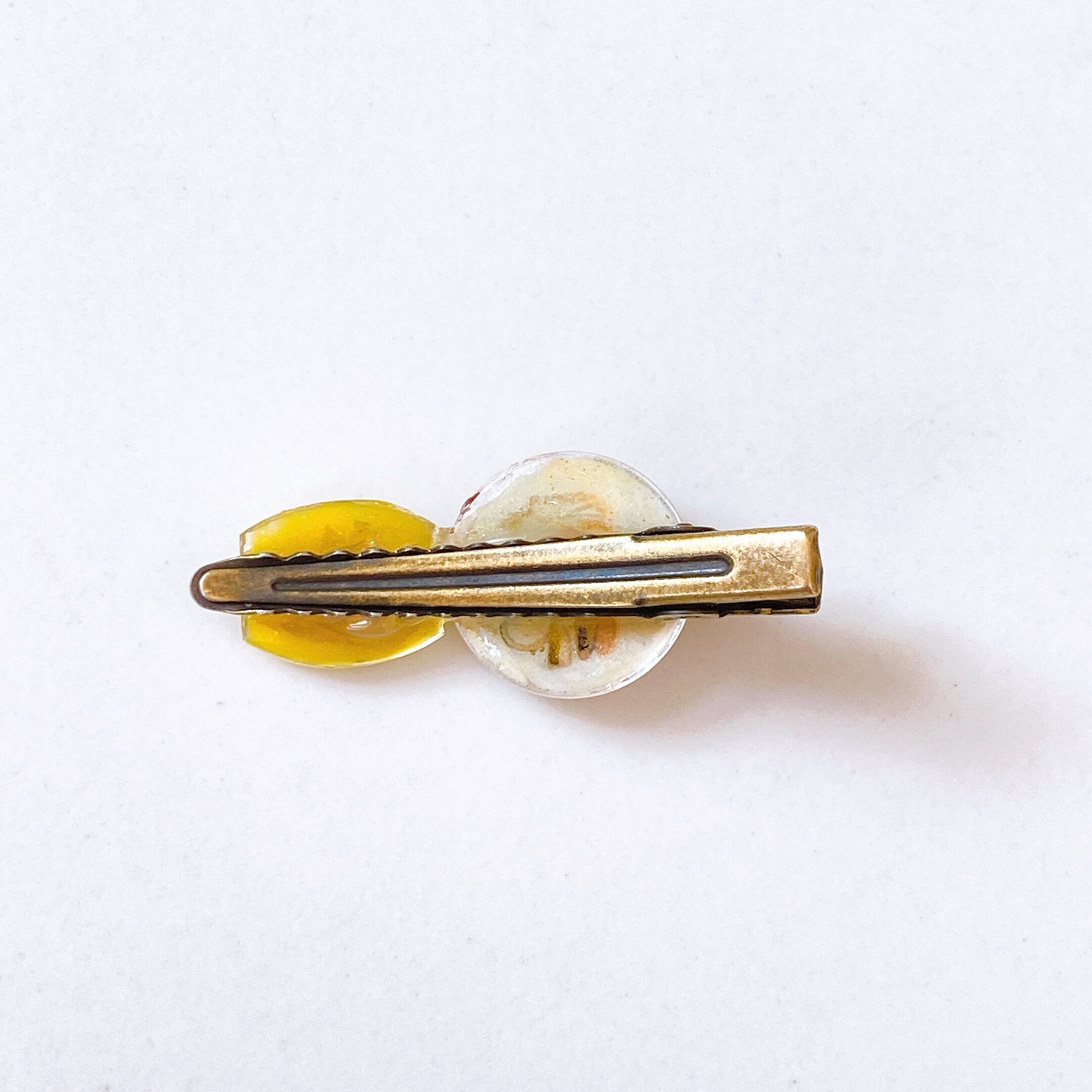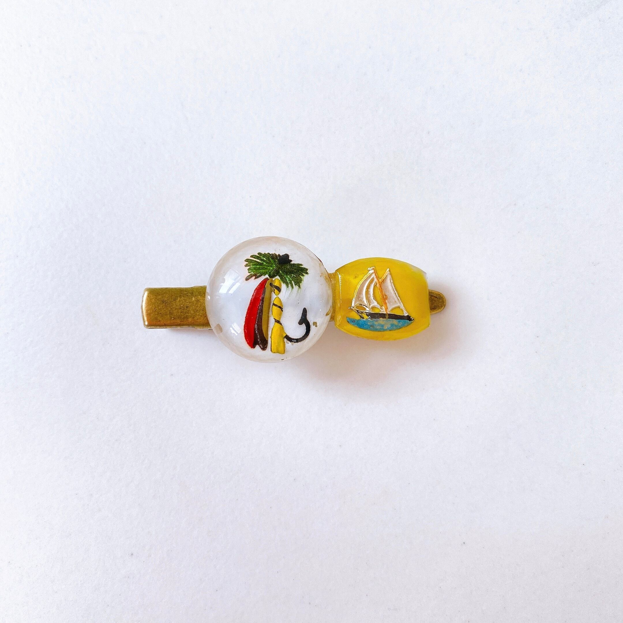 アメリカのハンドメイドジュエリーブランド、Joli Jewelryによる、海辺のフィッシングが題材となったキッチュなヘアクリップ! 使われているのは1950年代に手作りされたガラスストーンで、どのストーンもひとつひとつ手描きされているので同じデザインでもよく見ると微妙に違います。ヨットのストーンはシェイプも変わっていますね。50年代から60年代に人気のあったこのガラスストーンは、子供服のボタンやシャツのカフリンクなどに使われていました。今ではとても貴重なこのガラスストーン 。デザイナーの手元にあるだけしか作れない希少価値ある作品です。