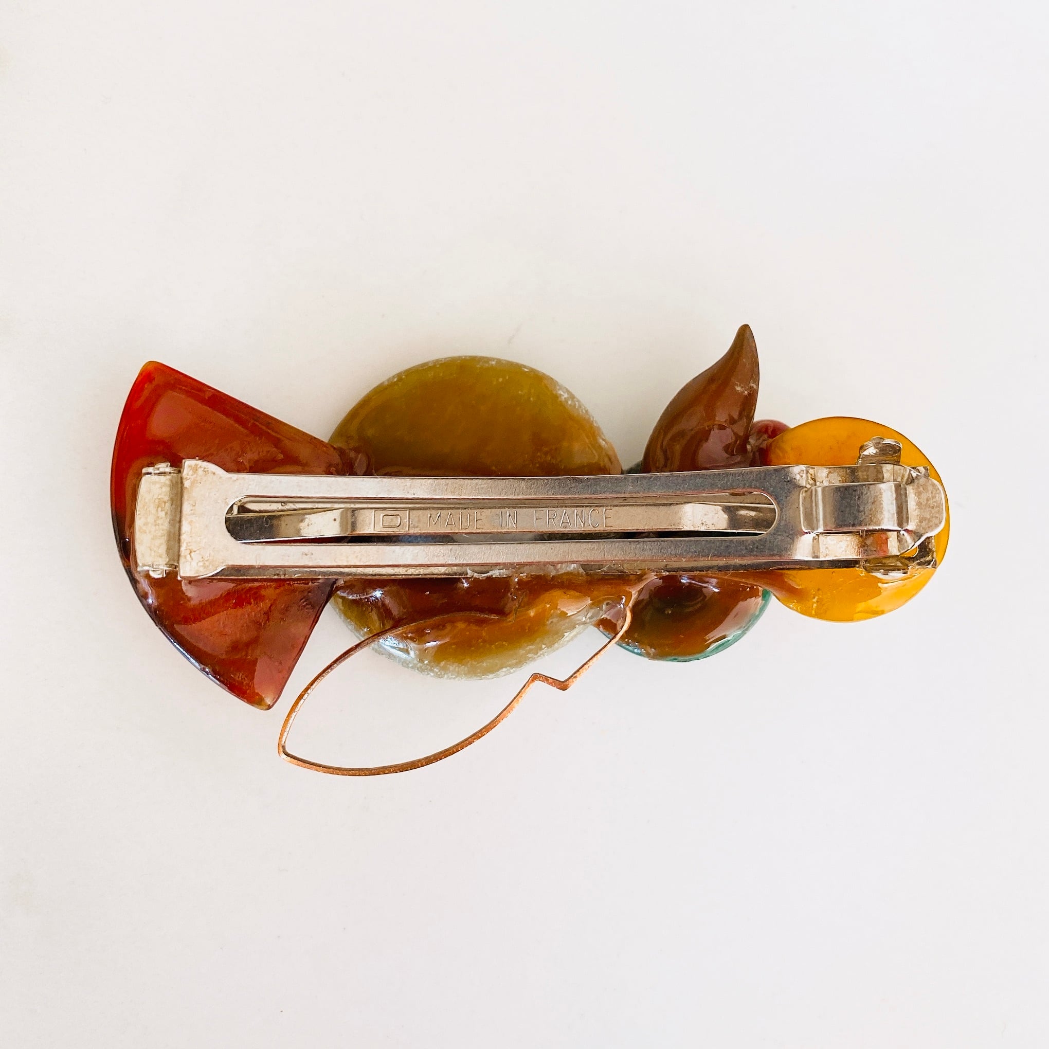 Joli Jewelryによって秋をモチーフに作られた髪飾り(バレッタ)。落ち着いた色合いで、自然が様々な顔を見せてくれる秋の様子をビンテージ天然石で見事に表現しています。重みもあり、付けていてとても満足感を得られる作品です。
