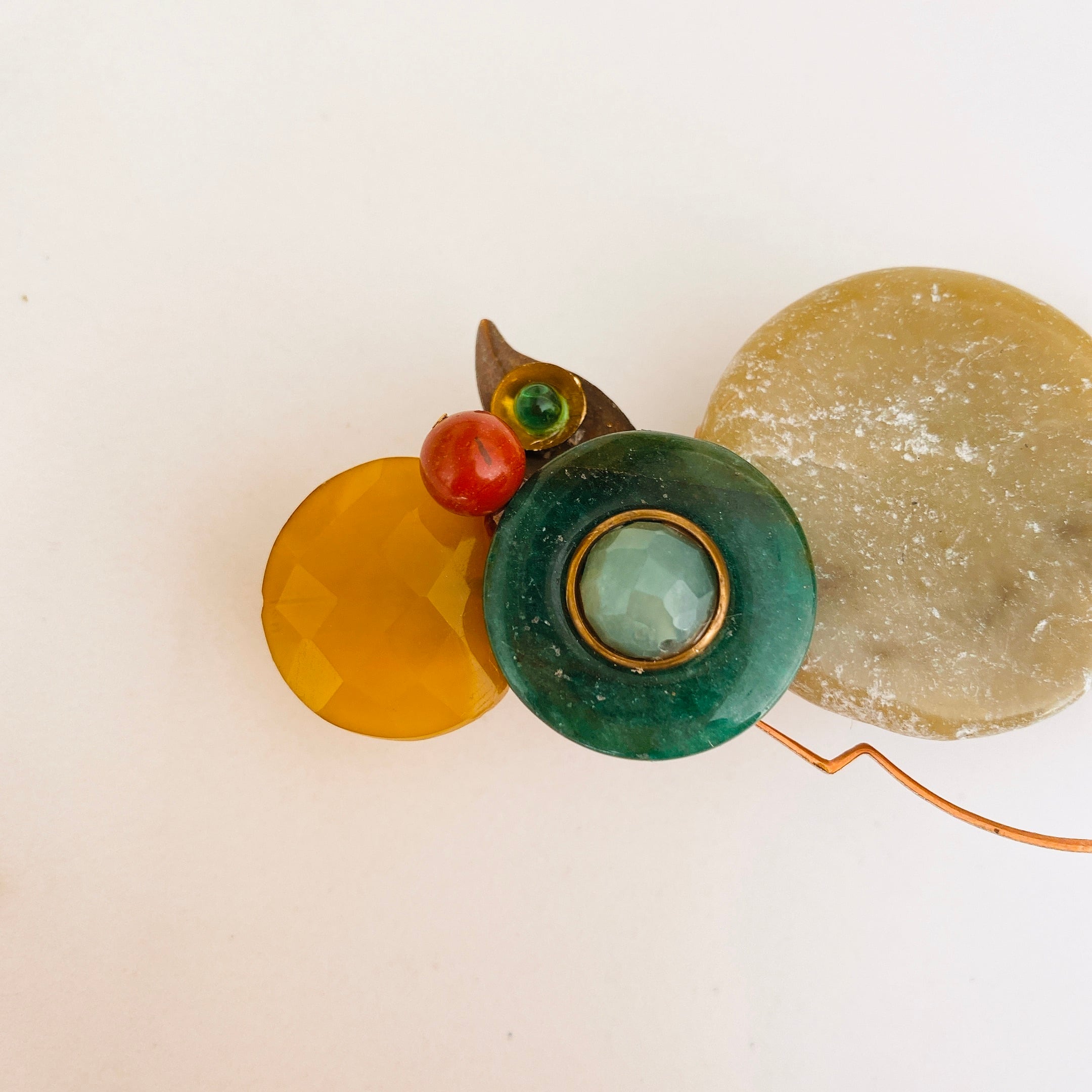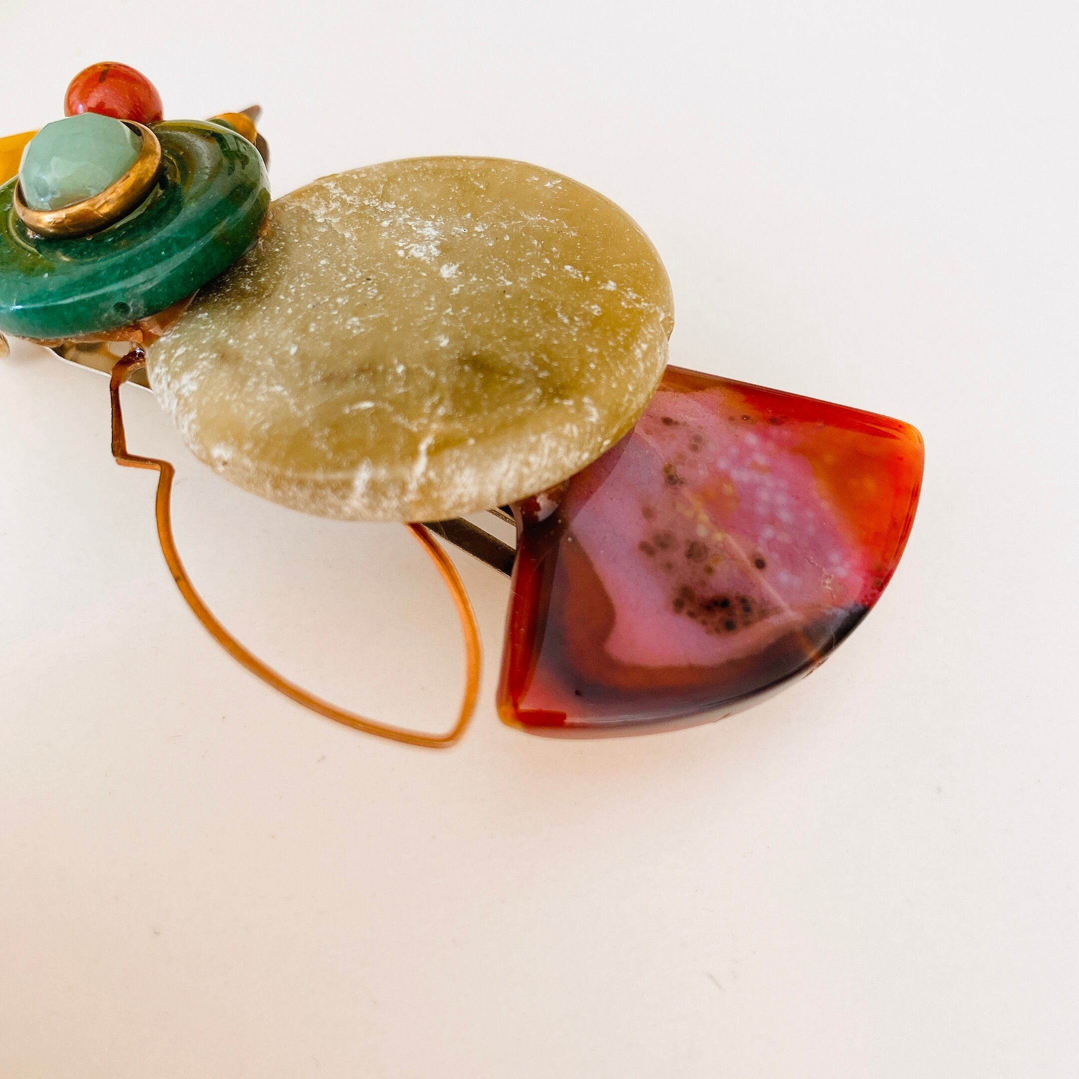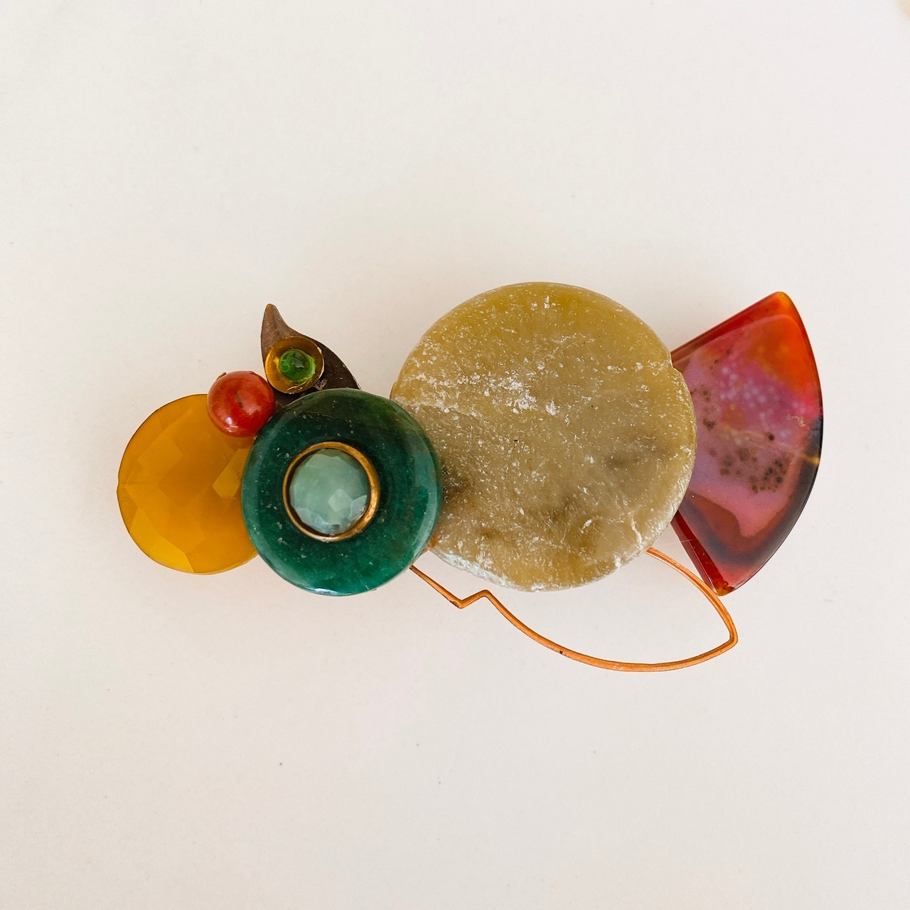 ★マテリアル:1940年代のビンテージガラスストーン、50年から60年代のビンテージ天然石(カルセドニー、赤碧玉、苔めのう、カーネリアン)、ヒスイ、ビンテージブラス、フレンチバレッタ(メタル)