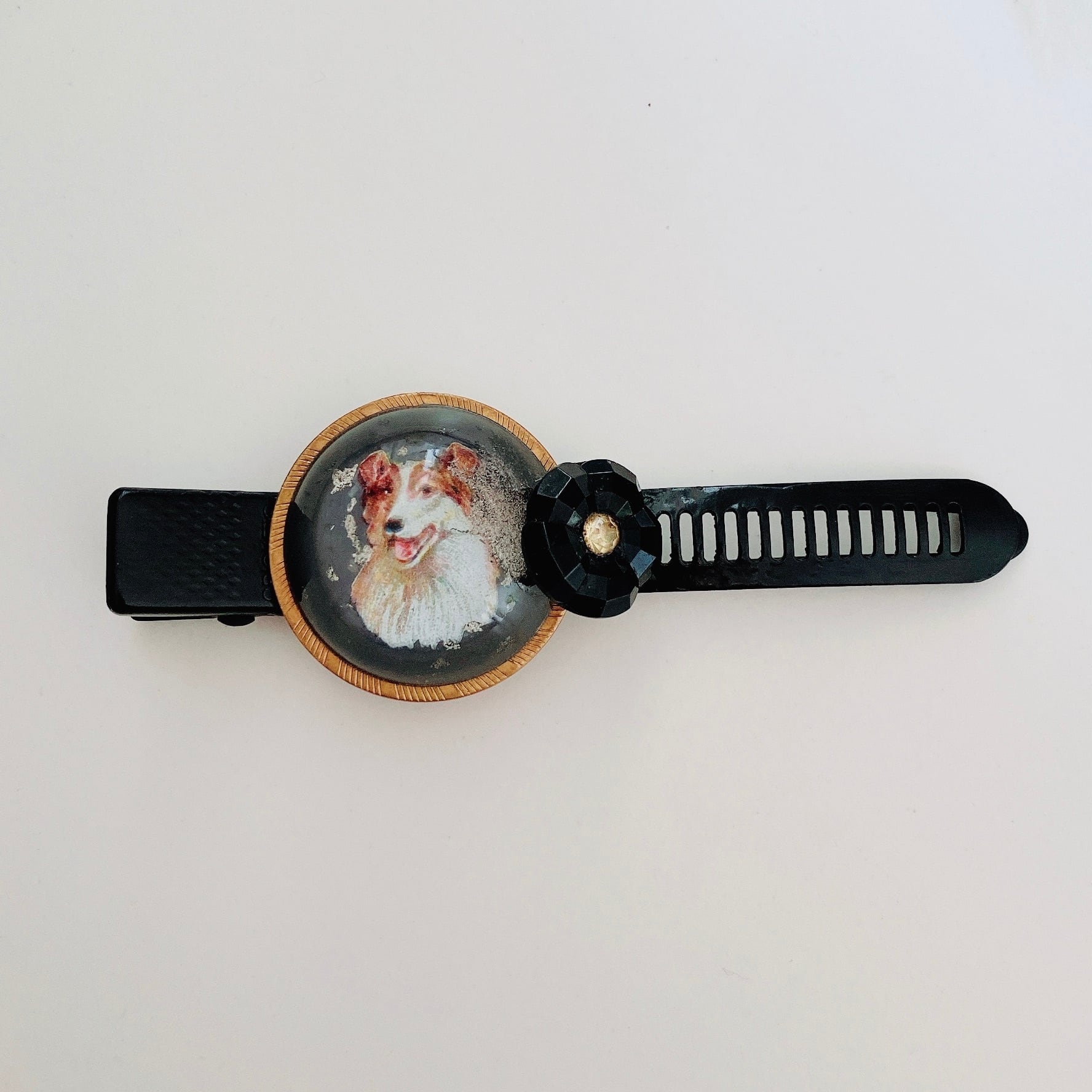 50年代に製造された『名犬ラッシー』のガラスストーンを使ったミディアムサイズのヘアクリップ。ラッシーがどういった犬なのかご存知ない方も多いかもしれませんが、元々は40年代に発表されたラフコリーを主人公にした小説で、その後、映画化され、50年代から70年代にはテレビドラマ化もされ、世界で一番有名な犬となった犬なのです。