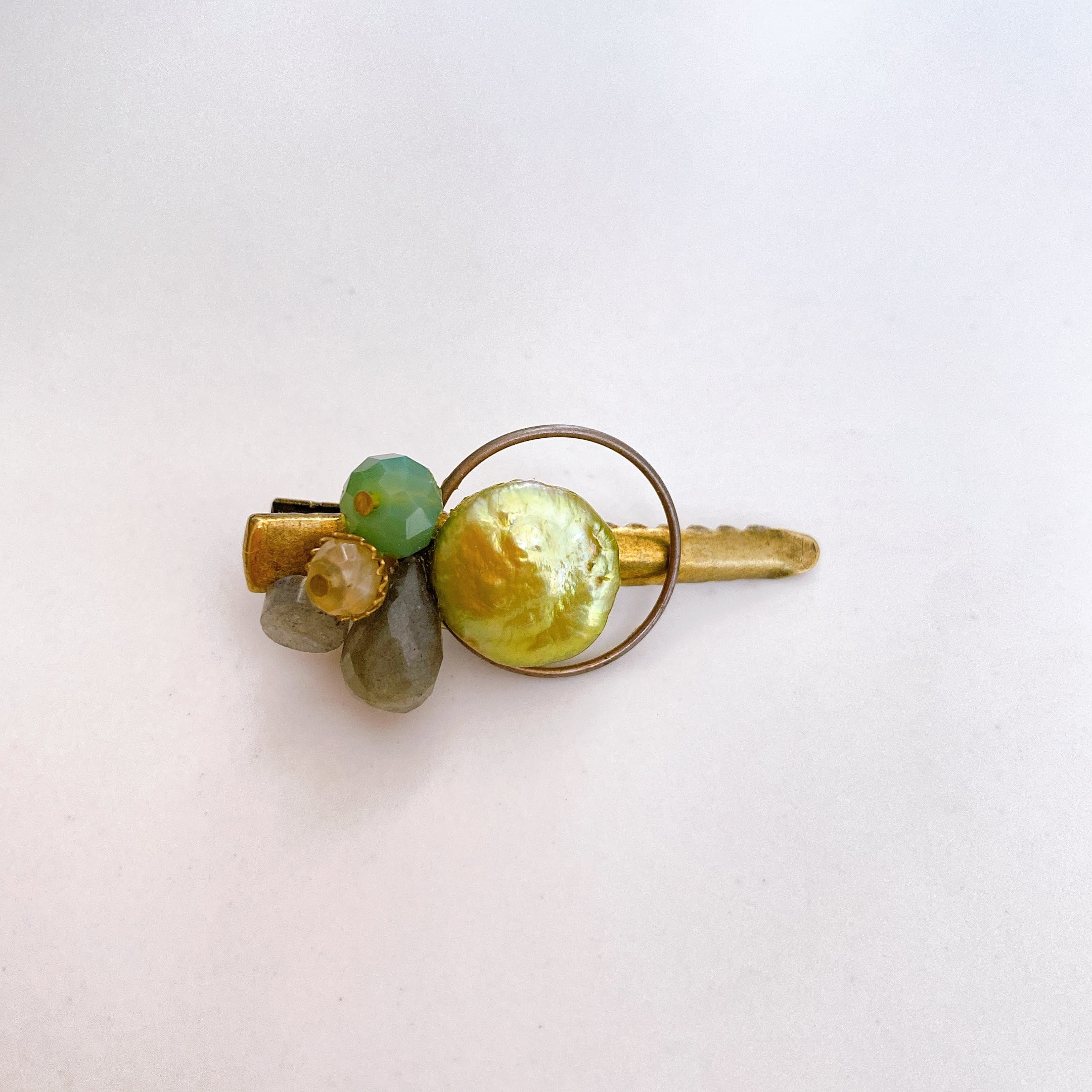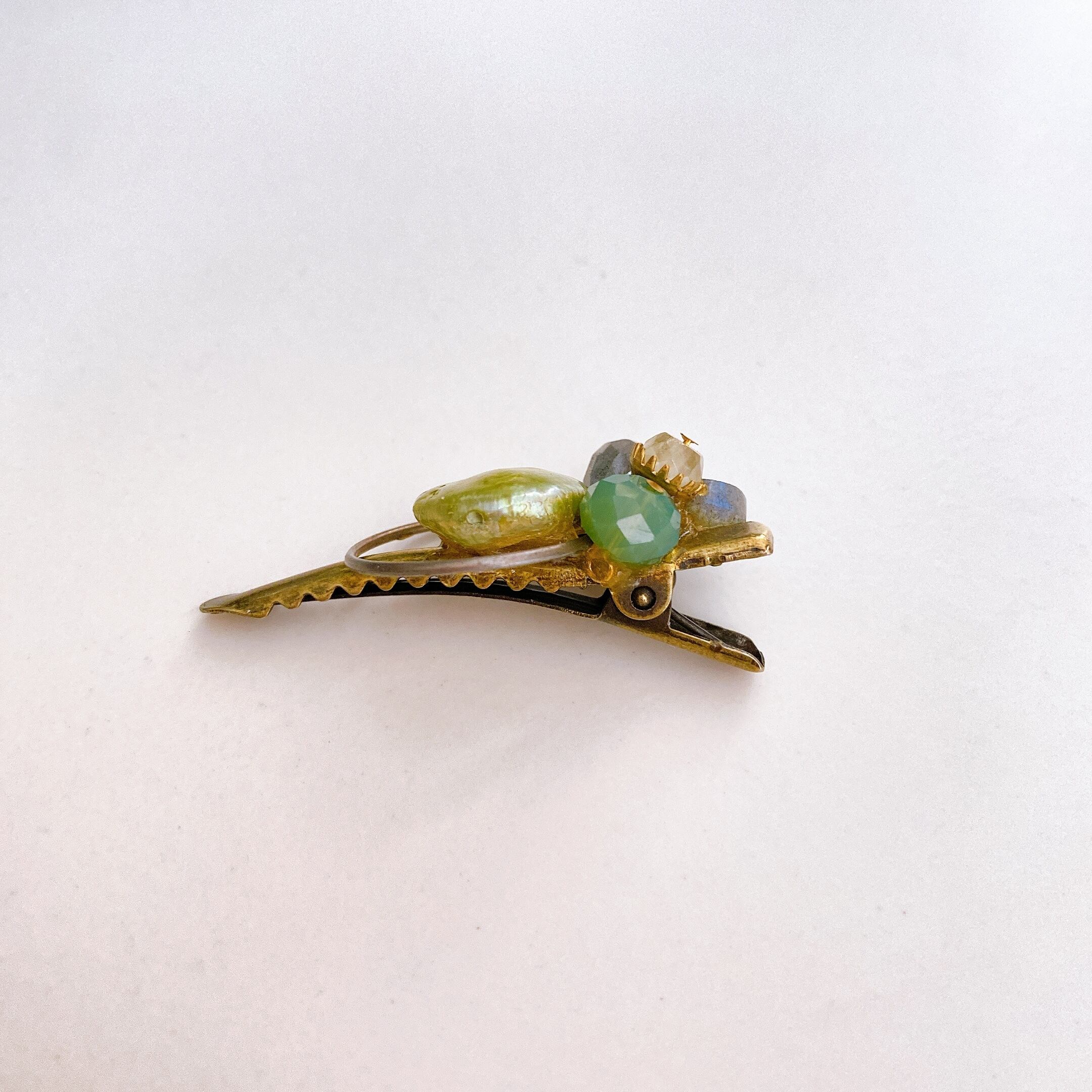 メインの淡水パールはまだ青味がかったレモンのような黄緑色で、その横には4つの小さな半貴石が飾られています。元々はヘアクリップですが、ピンとしてもご使用できます。カバンに付けてもよし、帽子に付けてもよし、贅沢ですが何かを挿むクリップとしてご使用になっても良いですね。拘らずにお好きなようにご使用ください。