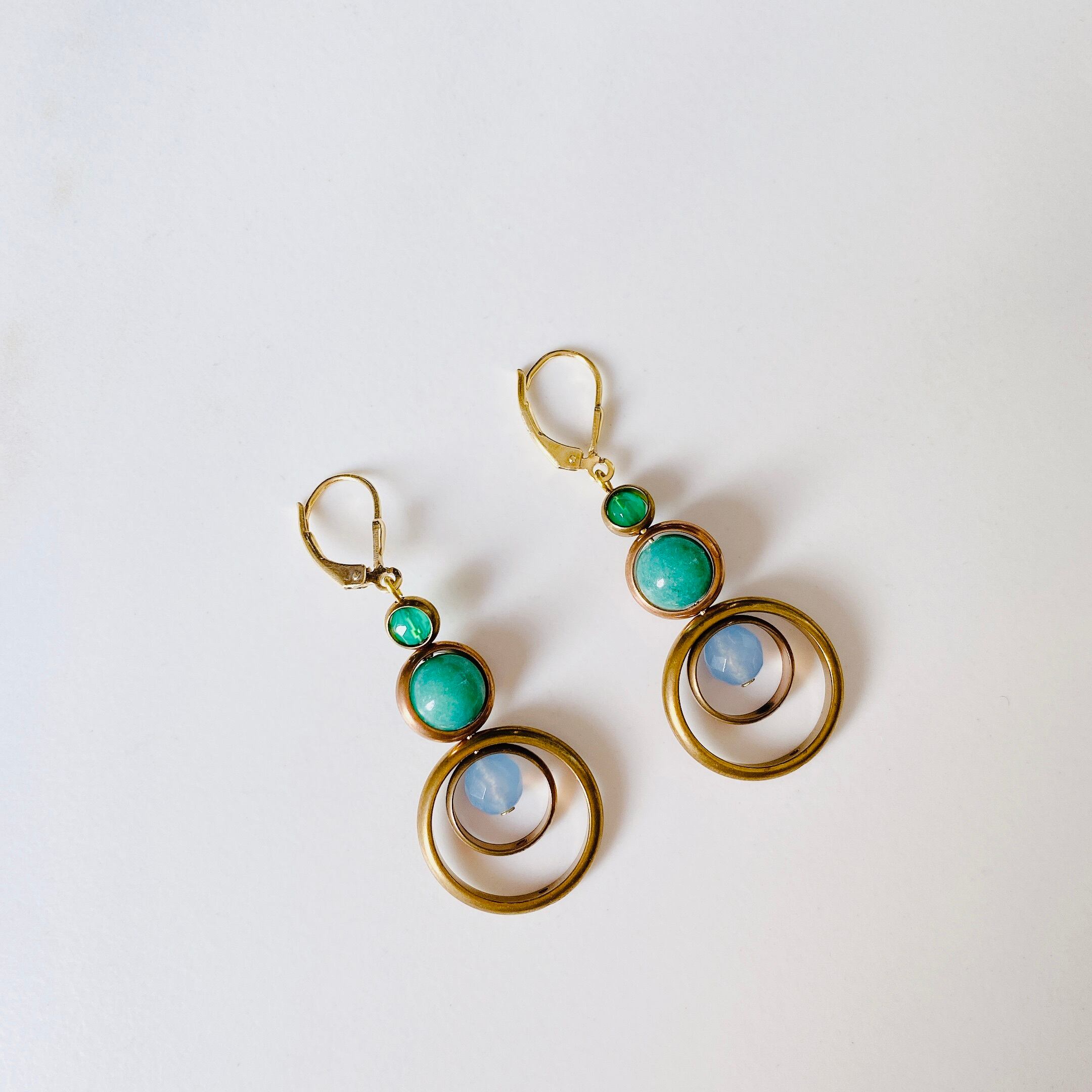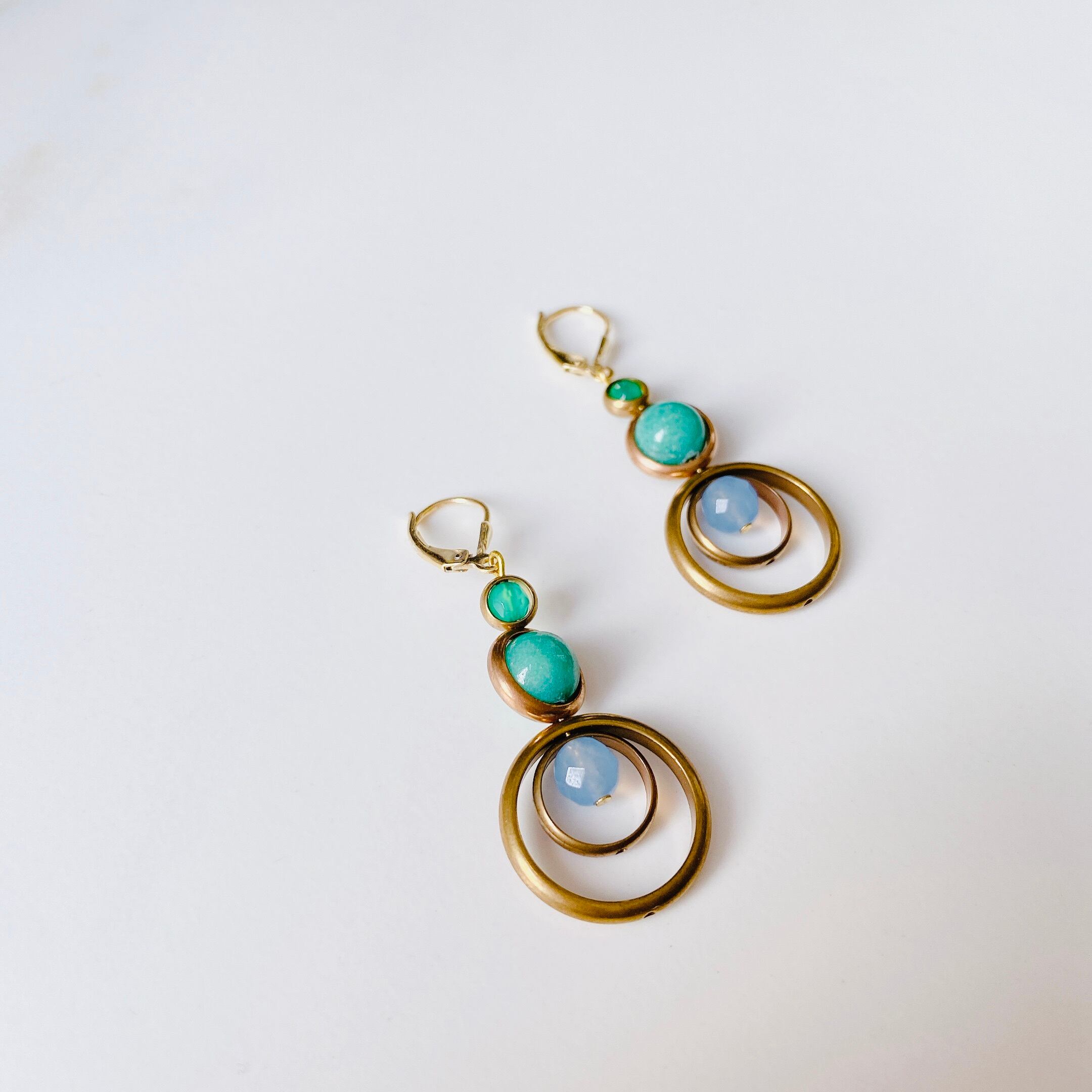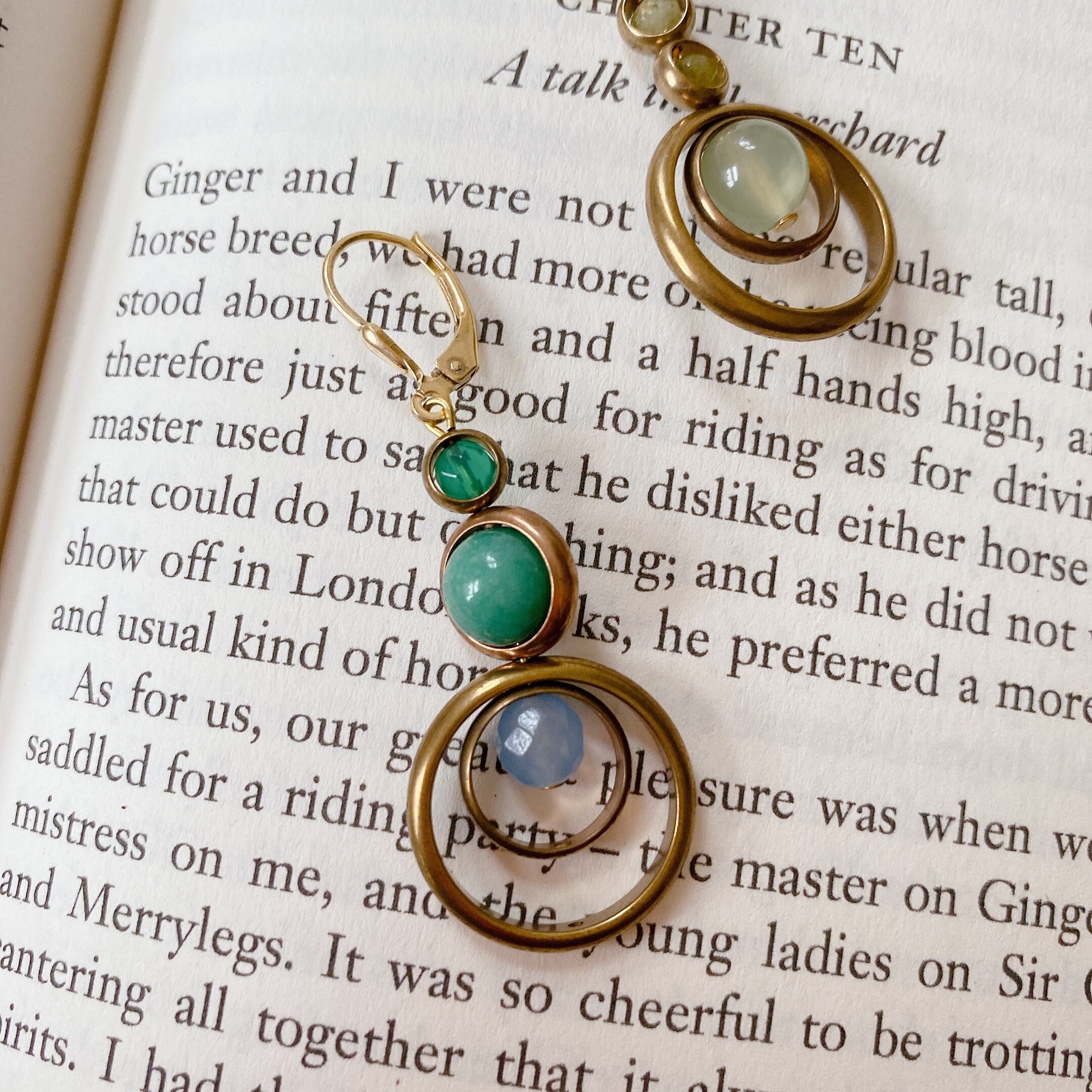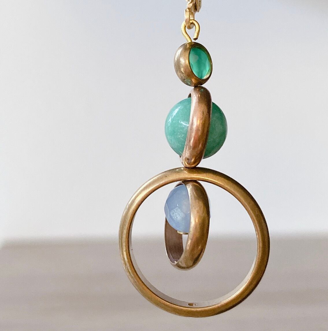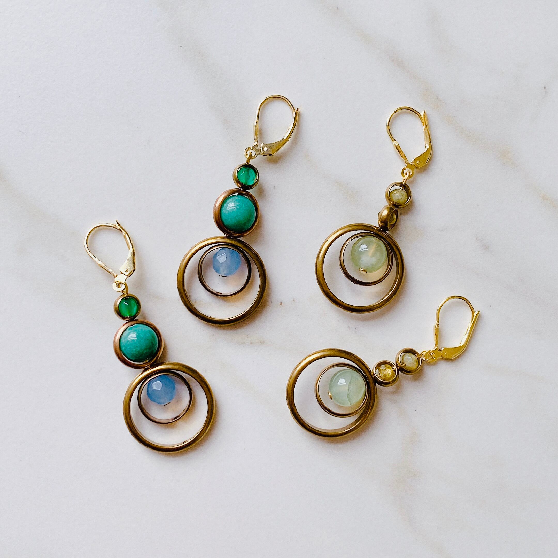 ターコイズグリーン(明るい青緑色)のクリソプレーズとグリーンオニキス、ガラスのビーズがブラス(真鍮)のフープに入った色の綺麗なイヤリング。どのブラスのフープもくるくると回る、遊び心のある愛らしい作品です。