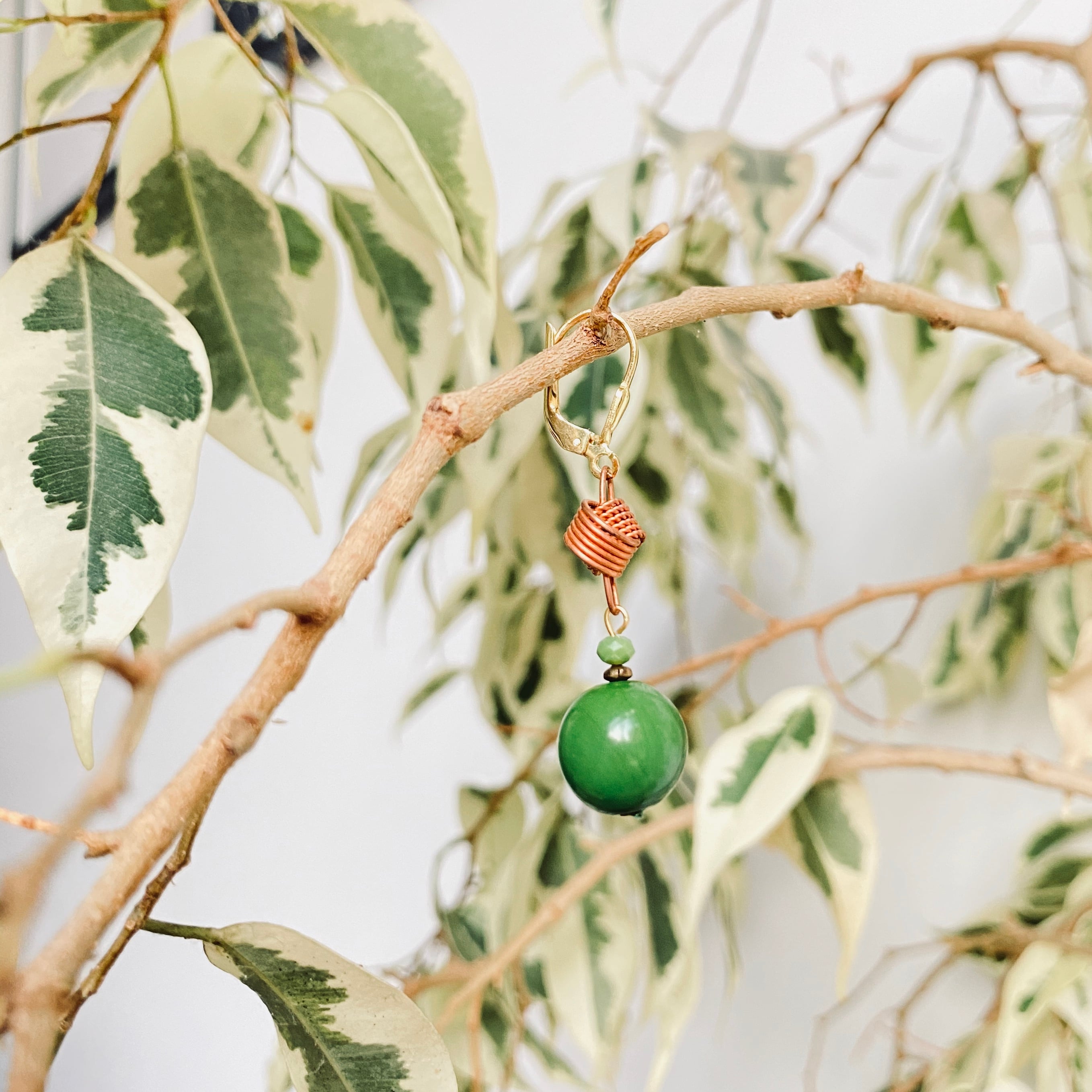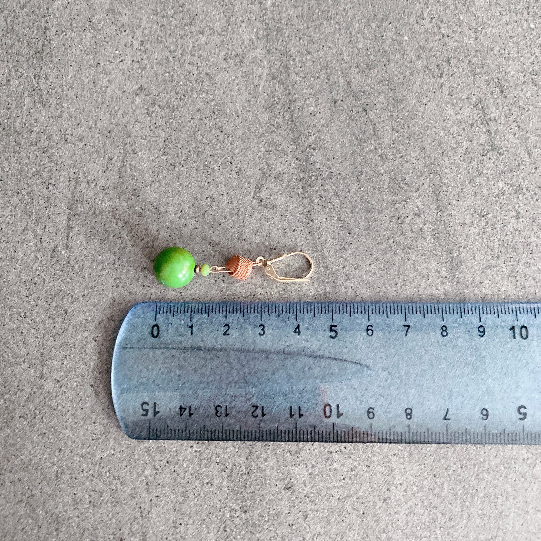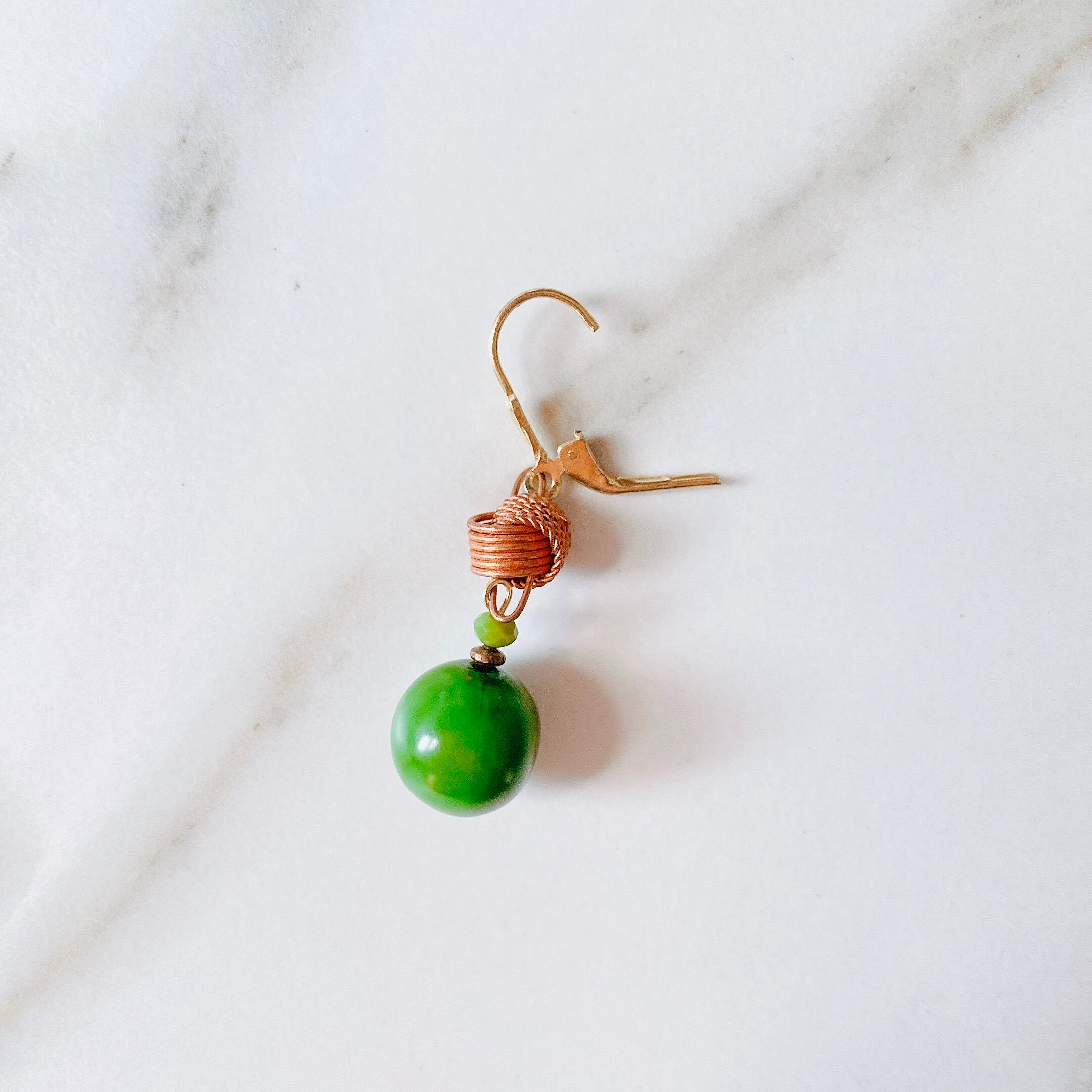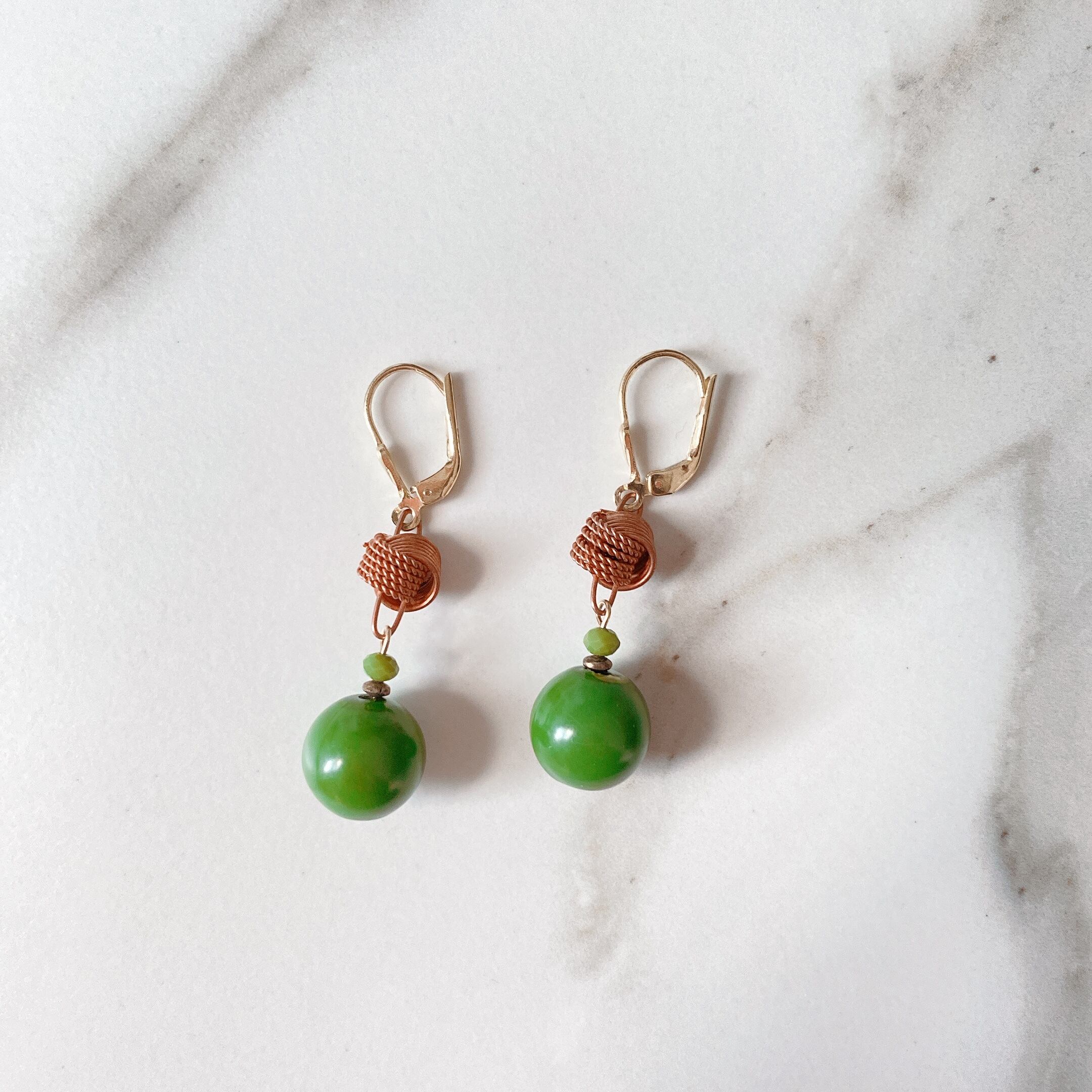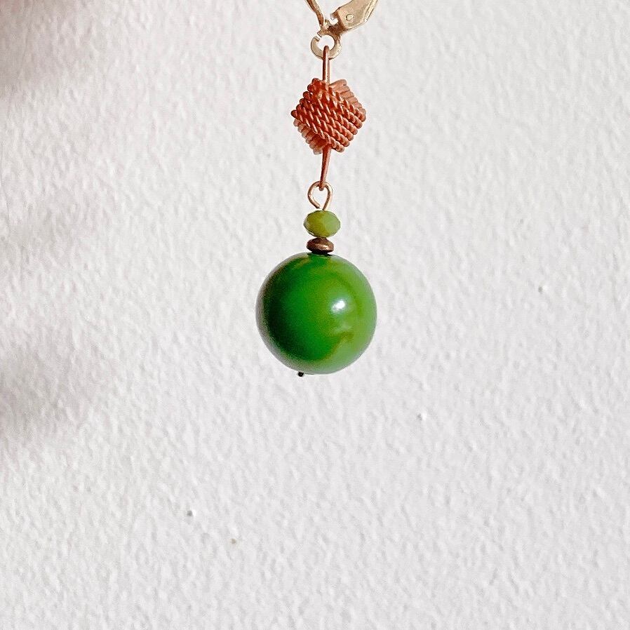 60年代に製造された綺麗な緑色(ケリーグリーン)のプラスチックのボールにヴィンテージコッパーでできた結び飾りと小さな円形クリスタルのストーンが添えられた作品です。