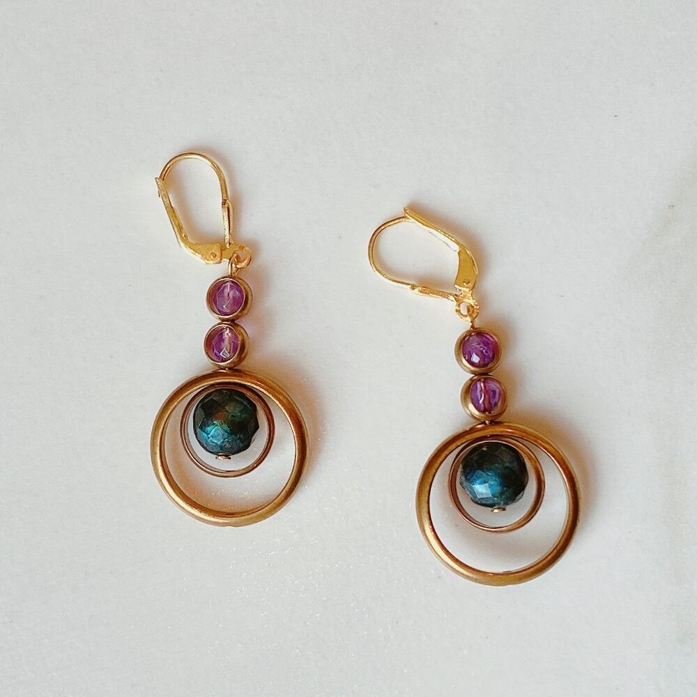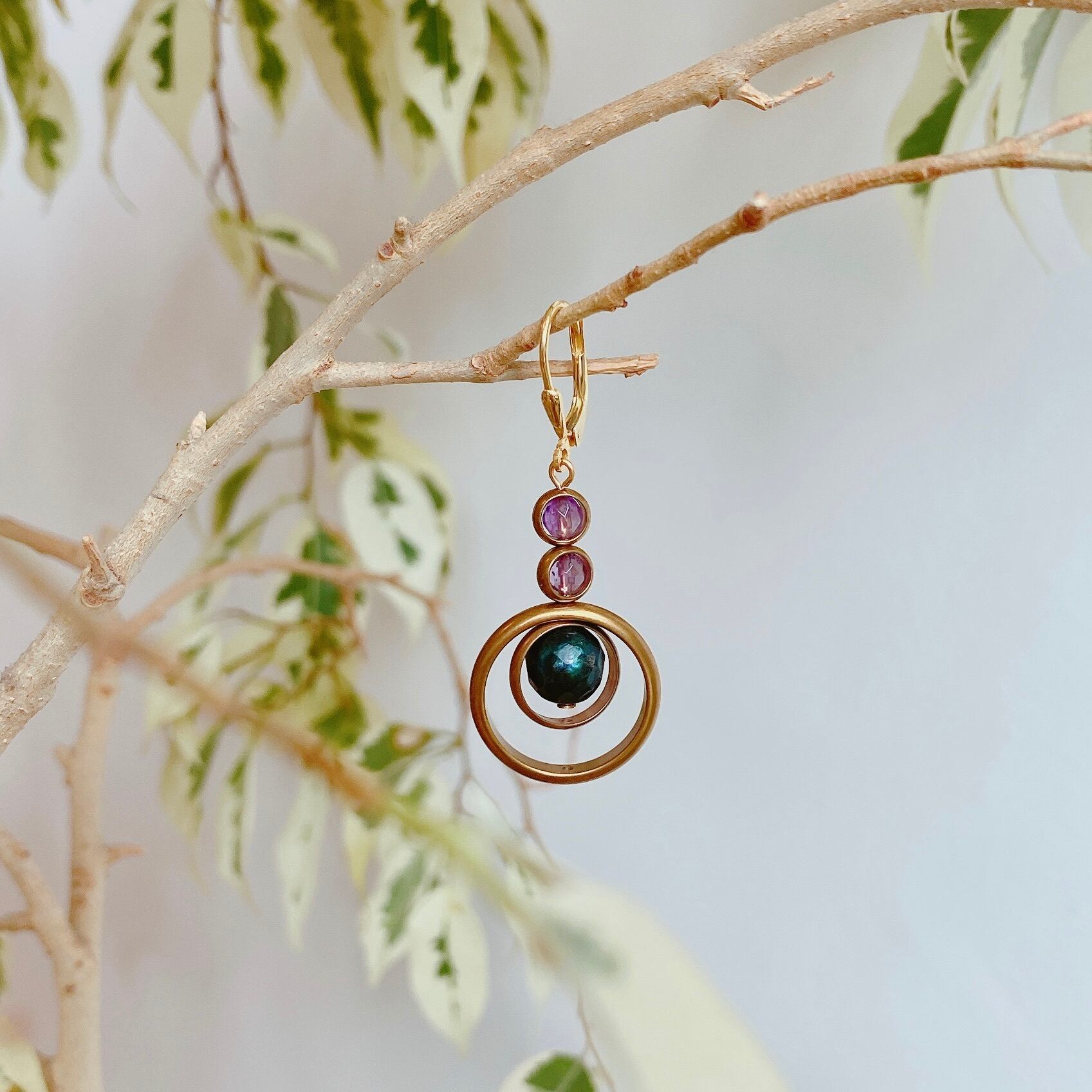 玉虫のような深い緑色と高貴な色として昔から愛されてきた紫色のコンビネーションがとても魅力的で、周りを囲む真鍮(ブラス)のリングはくるくると回るように設置されている、動きの可愛らしいイヤリングです。