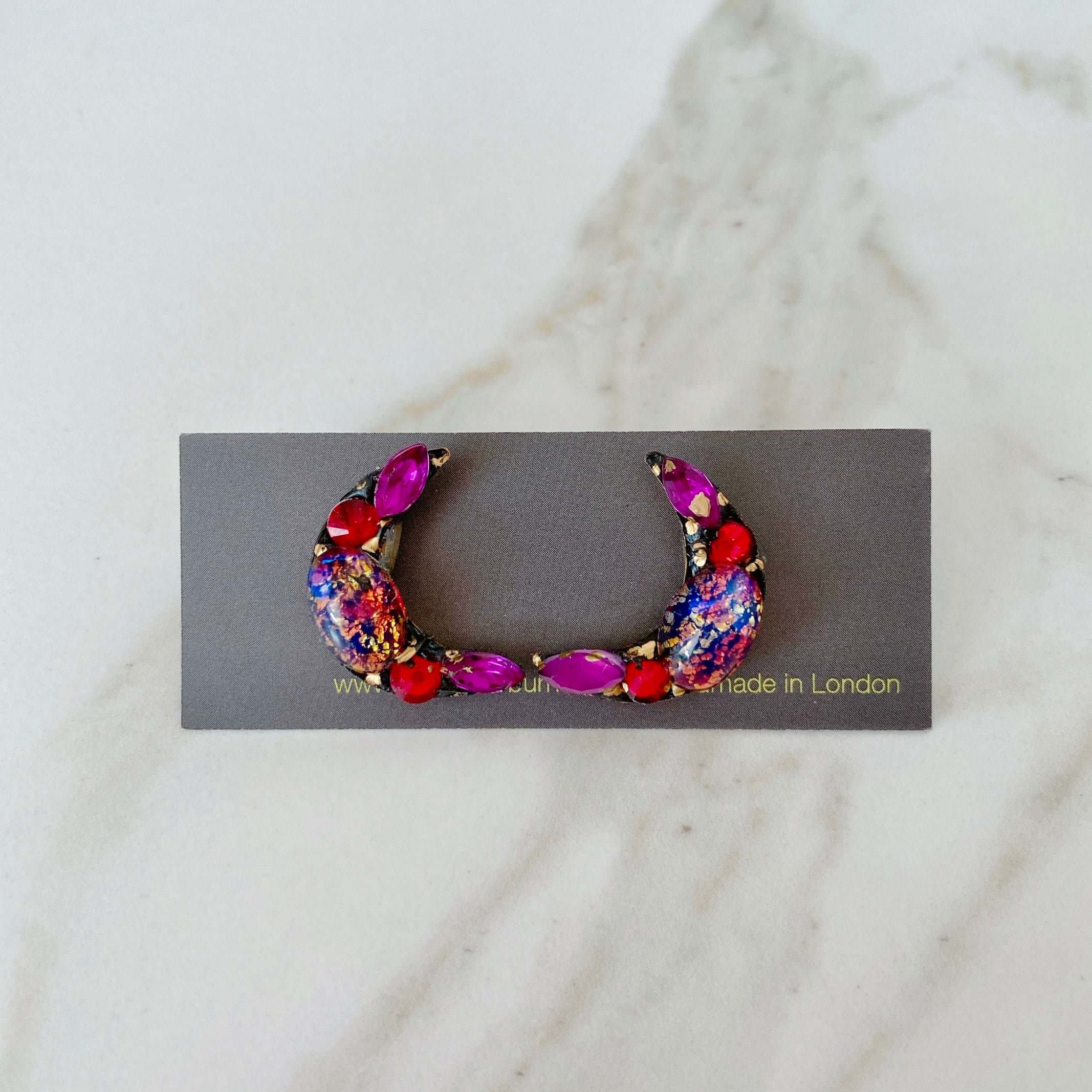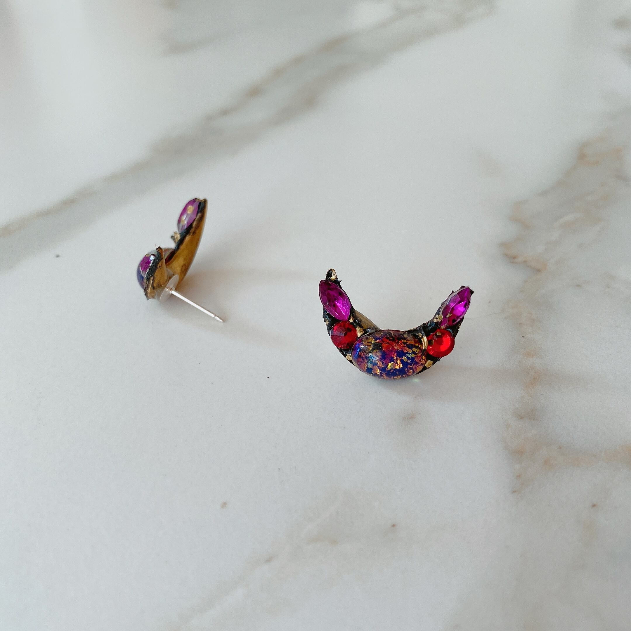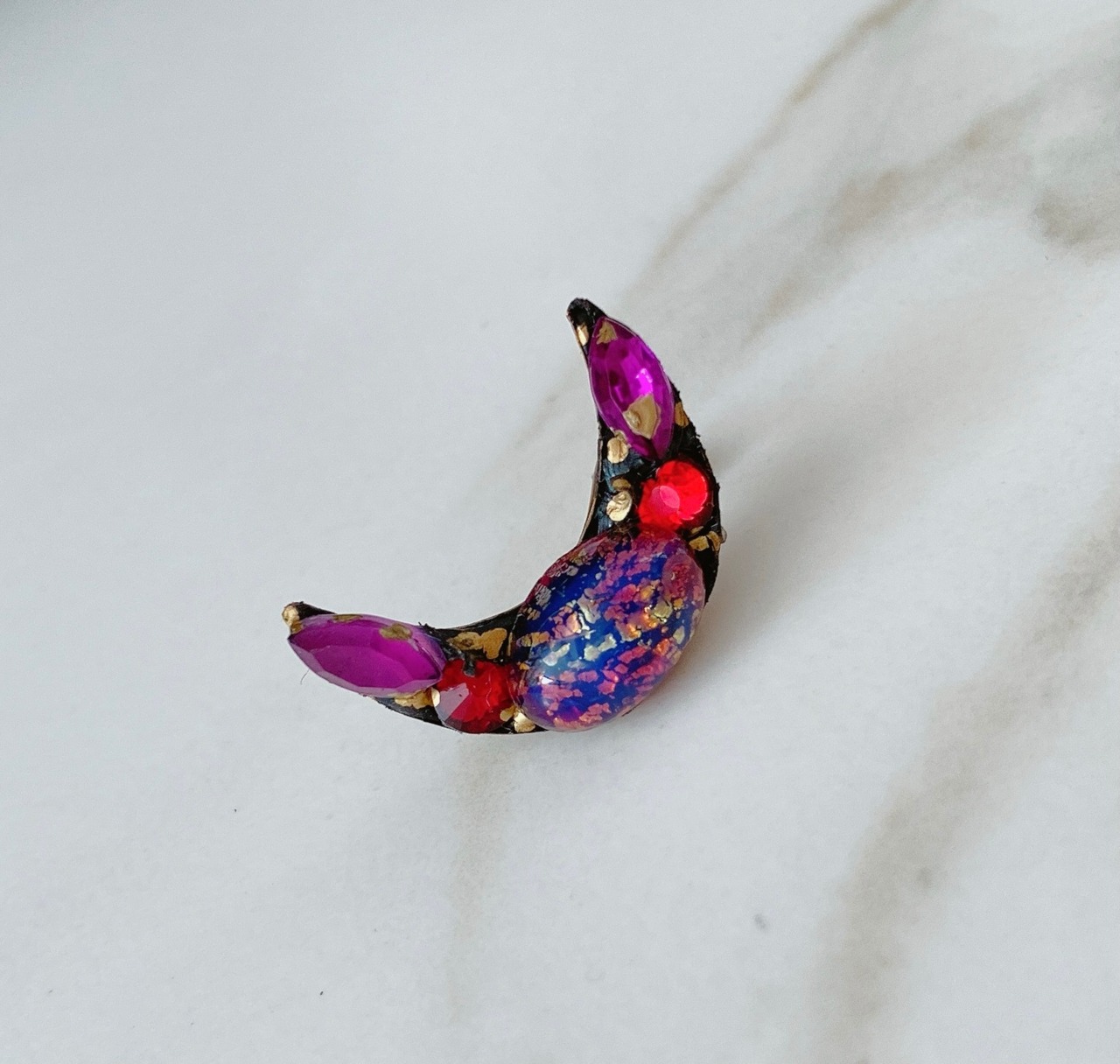 紫と赤のヴィンテージガラスストーンと真ん中にはゴールドフォイルで彩られたネイビーのカボションストーンで飾られている華麗な一点です。