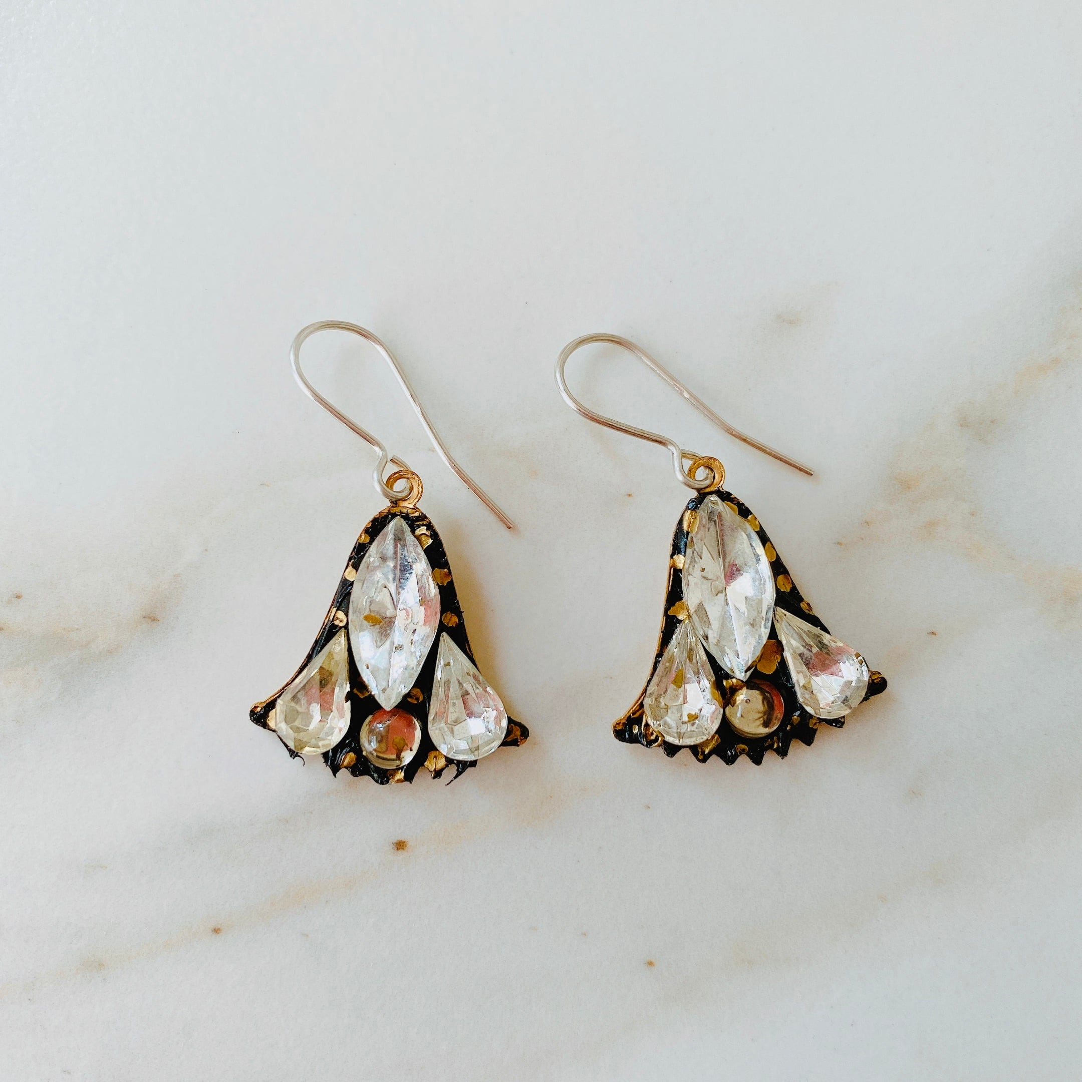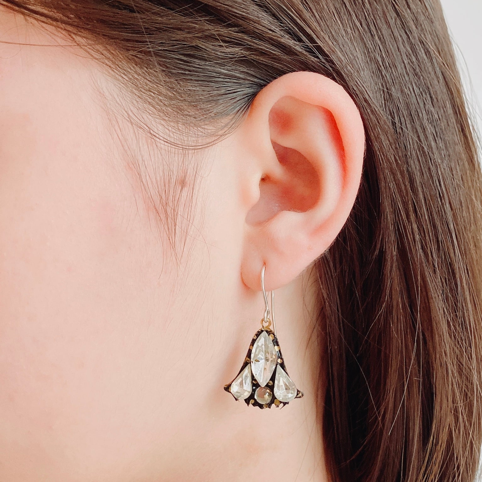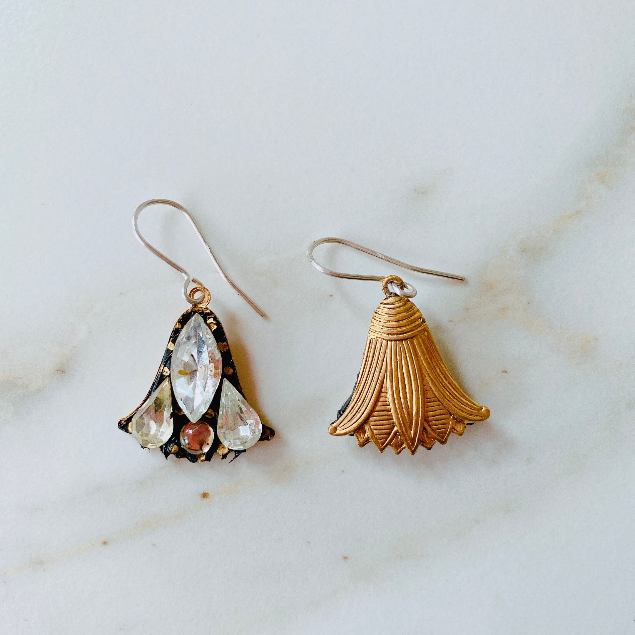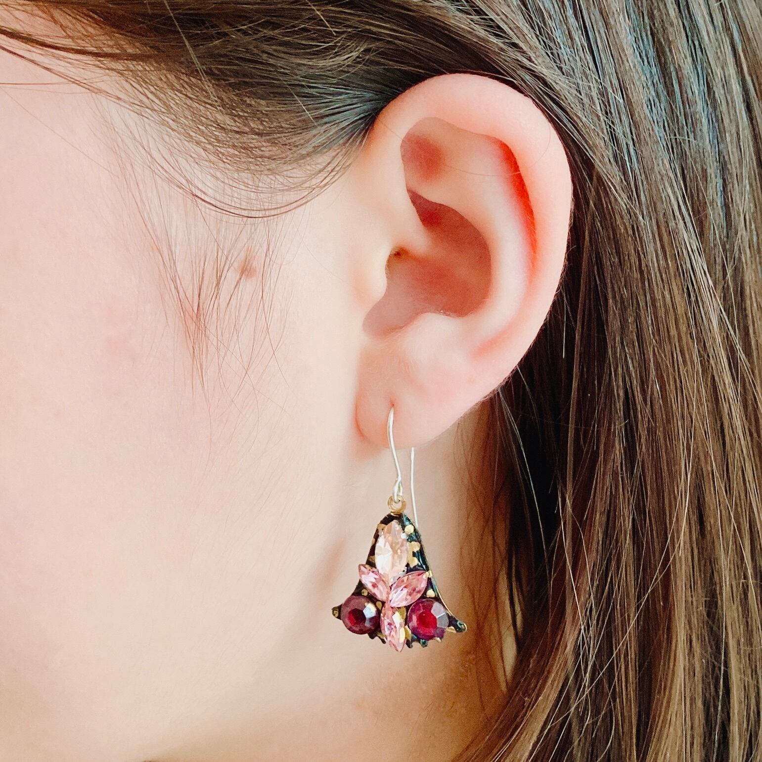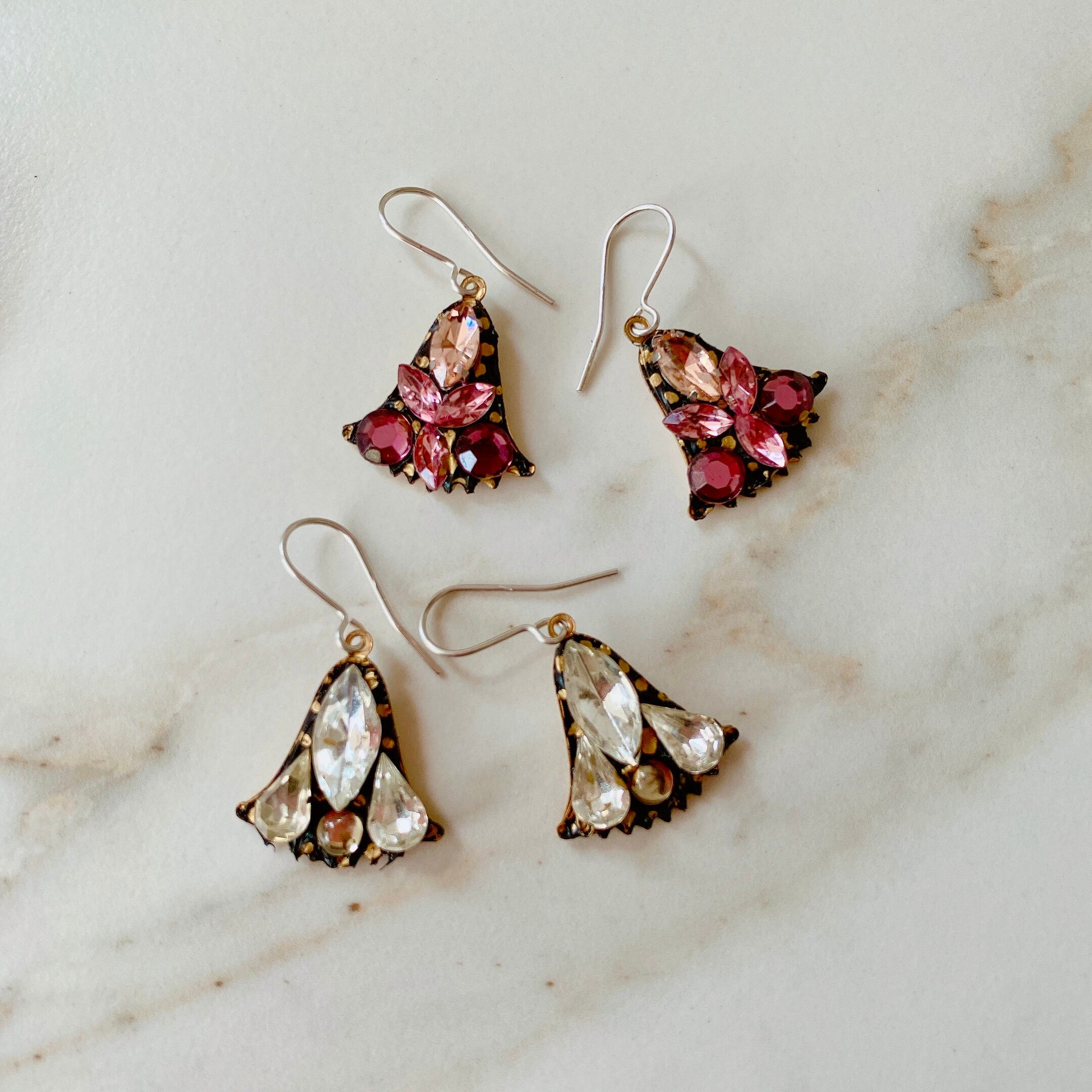 リリーがモチーフであるこれらのイヤリングは、上品かつ高貴なイメージのこの花とヴィンテージのガラスストーンの趣ある味わいが見事に調和して、とても素敵な作品に仕上がっています。