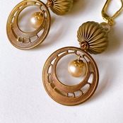 22ctのゴールドプレートされたレヴァーバックが留め具となったこのピアスは、全体的に落ち着いた渋い色合いで、ヴィンテージの材料のフィリグリーと提灯のような球体、そしてクラッシーなシャンパン色のパールがバランスよくデザインされた作品になっています。