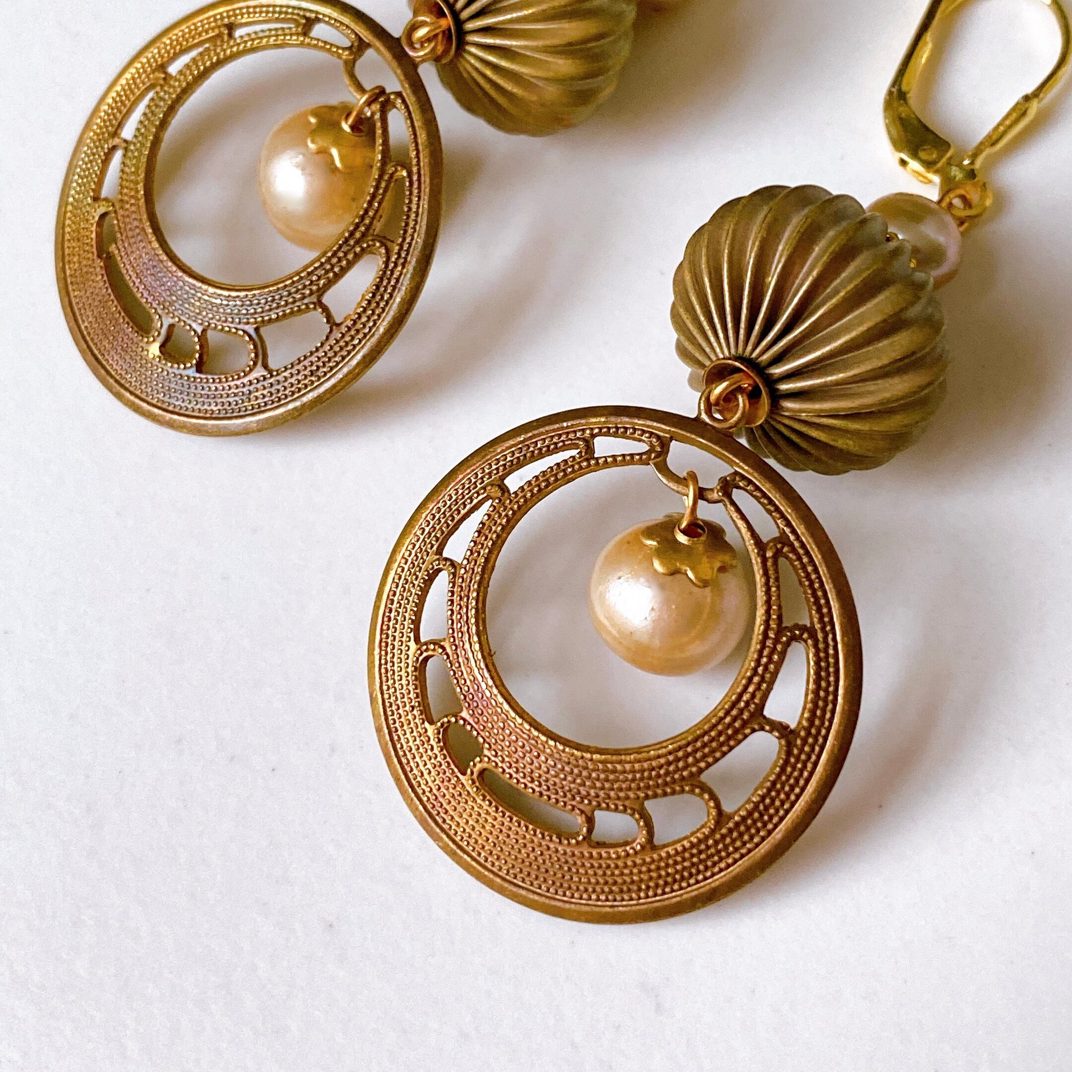 ジョリ・ジュエリーによるヴィンテージのブラスフィリグリーと淡水パールのドロップイヤリング。