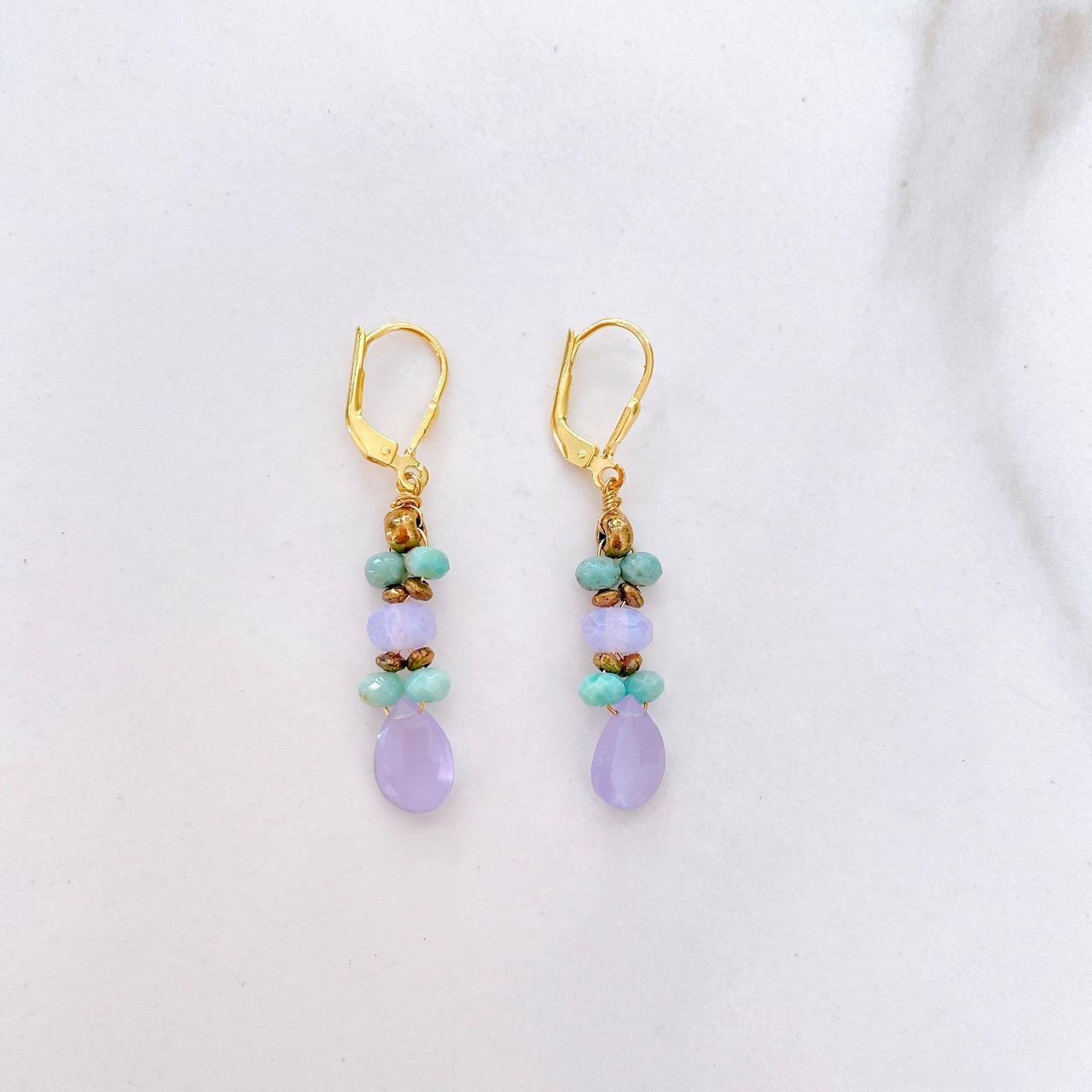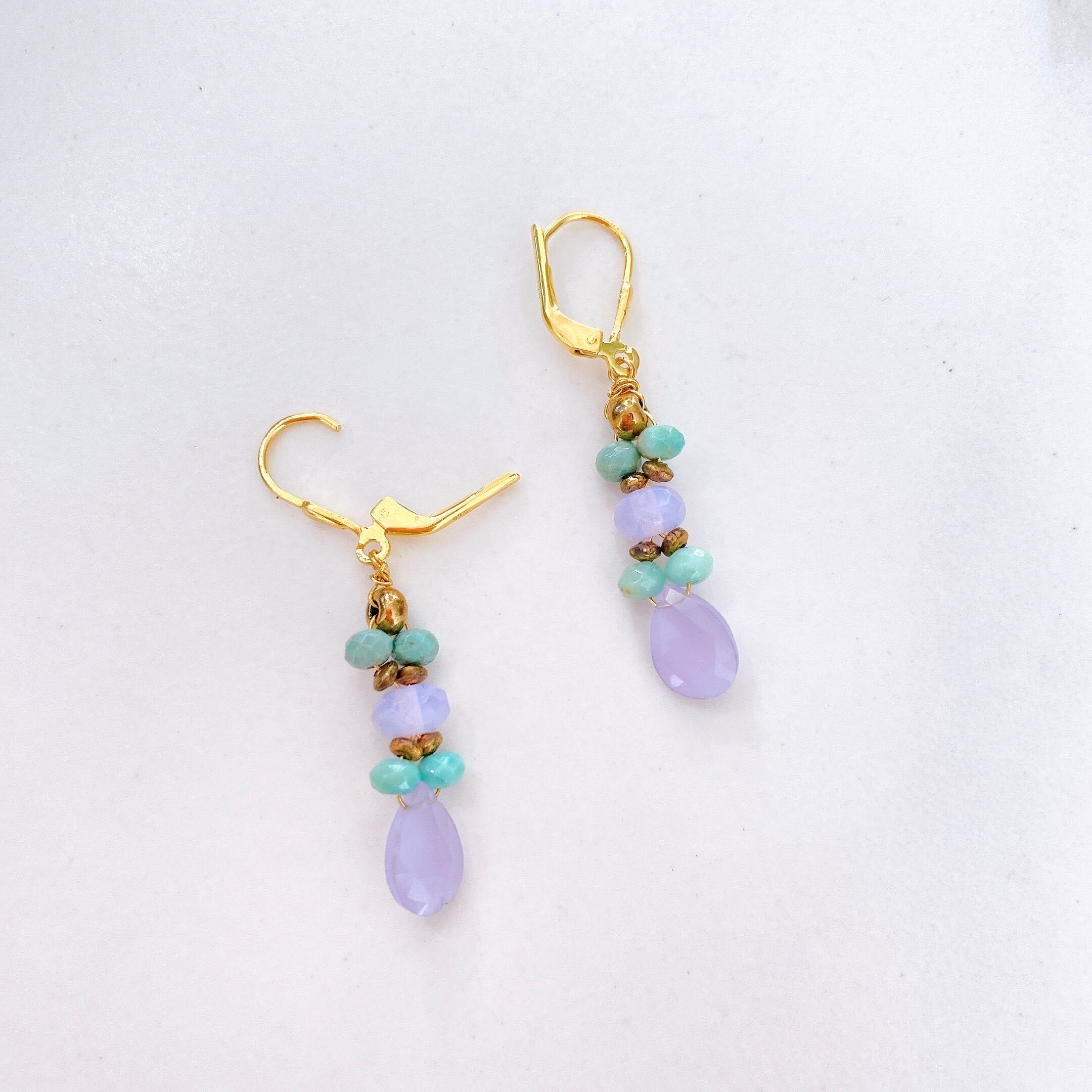 ラヴェンダー色のカルセドニーのドロップとミルキーグリーンのクリソプレーズのビーズ、そして、同じくラヴェンダー色のクリスタルビーズで作られた、とても優しい印象のイヤリング です。