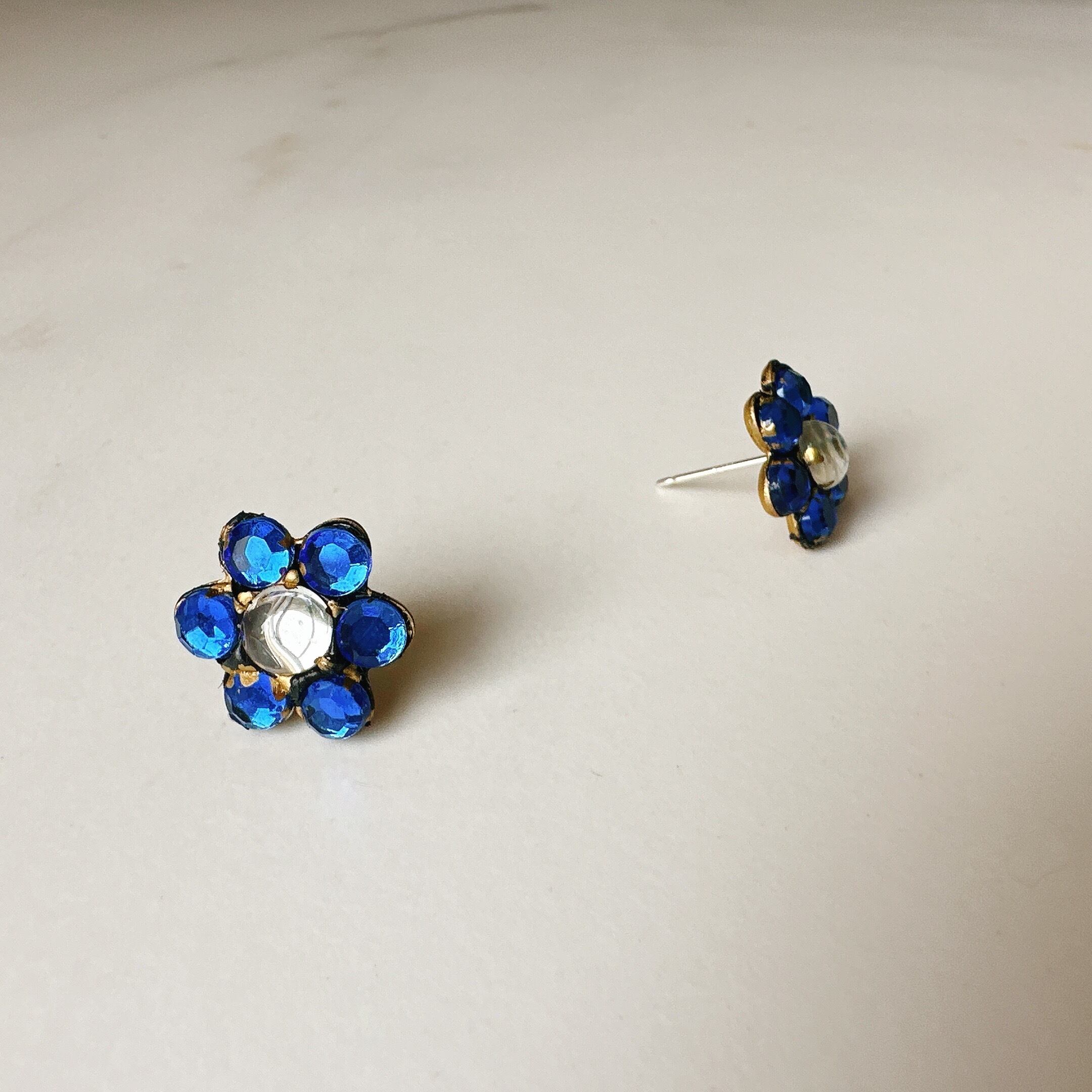 クリアストーンが中心に置かれ、その周りにはとても綺麗な青色のガラスストーンが6個装飾されています。大きさも可愛らしいサイズ感で、毎日のおしゃれに重宝する作品です。