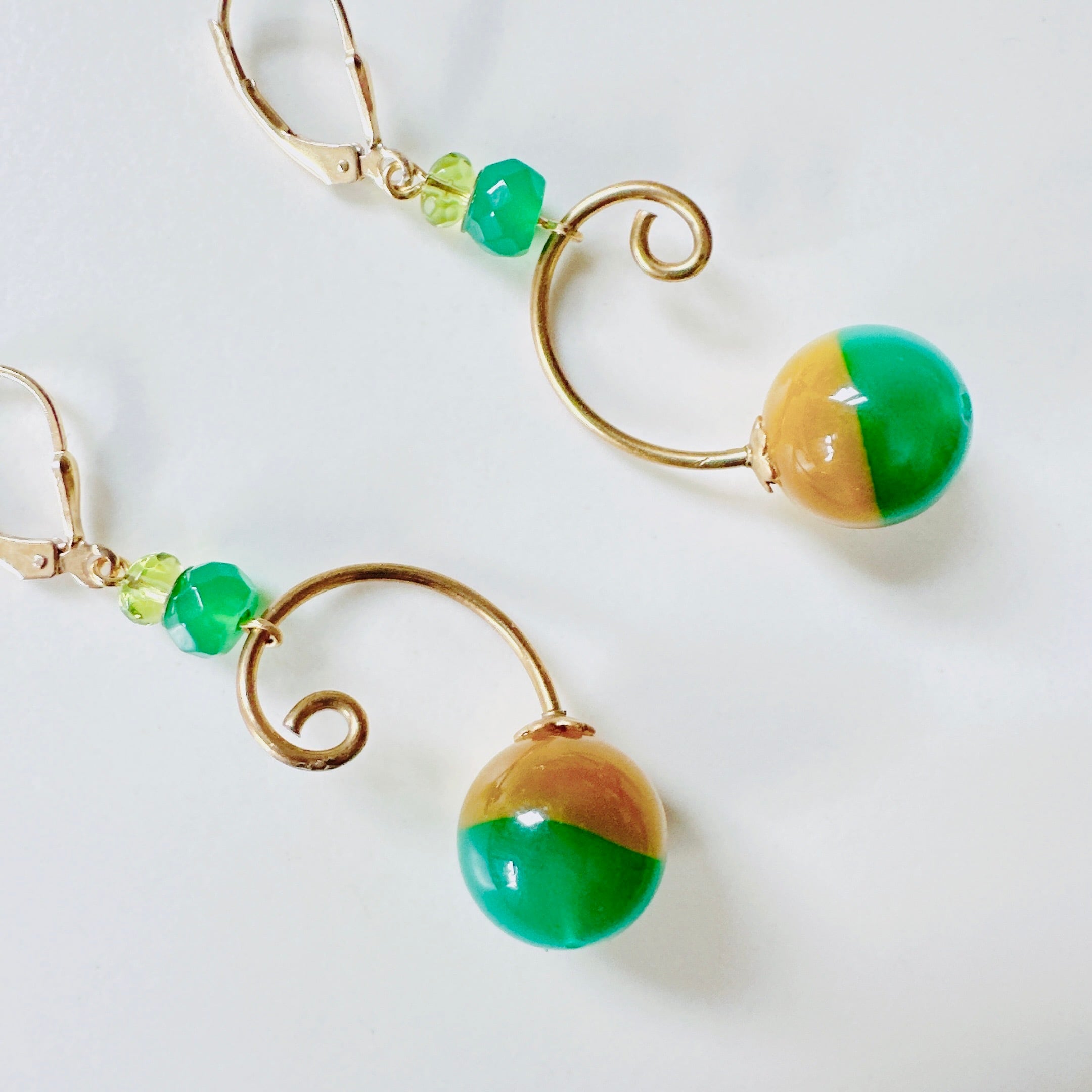 ヴィンテージブラスのカール具合も素敵で、その上に装飾された透明感のある緑色のニュージェイド(サーペンティン)とオリーブ色のクリスタルガラスビーズです。